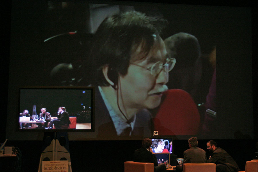 Le festival d'Angoulême, c'est avant tout la possibilité de faire des rencontres, notamment avec des professionnels de l'édition, qu'ils soient auteurs, éditeurs, journalistes spécialisés, ou autres. A tout honneur, commençons par ce qui était la principale rencontre organisée au Manga Building : celle avec Jirô Taniguchi (Quartier lointain, L'homme qui marche, etc.) et François Schuiten (Cités obscures). Jiro Taniguchi ne pouvant venir à Angoulême, c'est le festival qui est venu à lui grâce à l'organisation d'une visioconférence : |